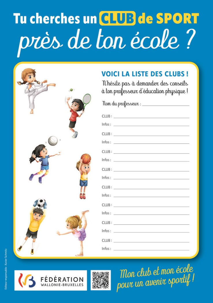 Il a également présenté ce projet à votre cabinet, Madame la Ministre: la création et la diffusion, dans chaque établissement scolaire, d'une affiche personnalisable, colorée et informative, qui reprend les coordonnées des clubs sportifs de proximité. Placée à un endroit stratégique de l'école, cette affiche permettrait aux élèves et à leurs parents d'accéder facilement à l'offre sportive du territoire, sans devoir effectuer eux-mêmes des recherches fragmentées.